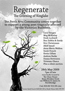 We are holding a fundraiser here in Perth to support Ella. “Regenerate: The Greening of Kinglake” will be an evening of poetry and song, featuring poets such as Kevin Gillam, Andrew Burke, Lucy Dougan and Sarah French, together with a silent auction of donated goods.