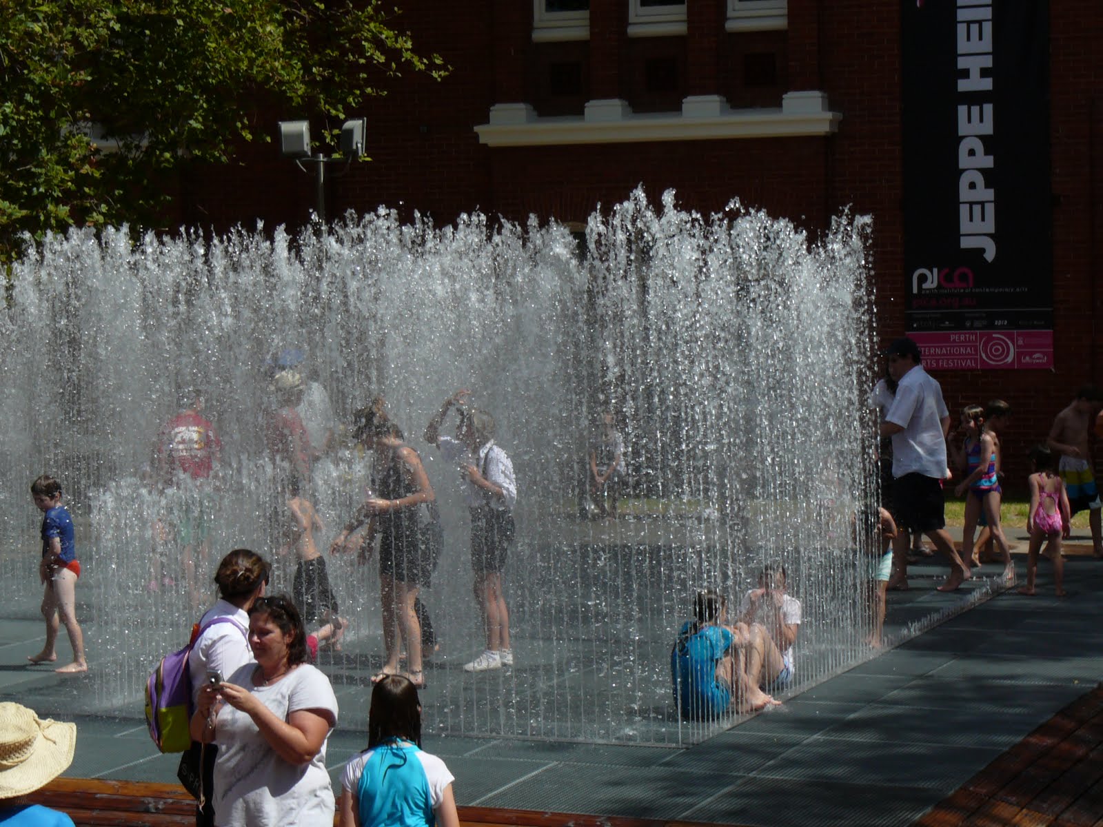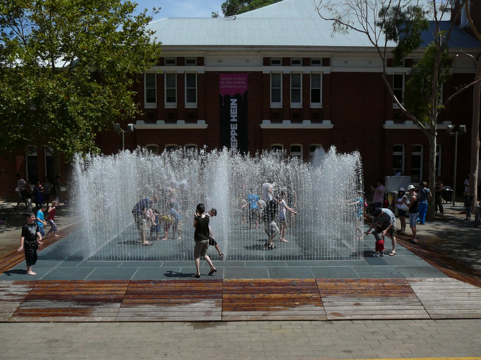 We stopped in yesterday, to the Cultural Centre outside PICA, just down the steps from the State Library, where Danish artist Jeppe Hein’s aquatic sculpture “Appearing Rooms”, is currently installed (though ‘installed’ seems the wrong word entirely somehow). We stopped past for a few minutes, just to check it out, to say ooh and ahh and I went and saw that Appearing Rooms thingy, kind of cool har har.