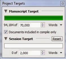 That anxiety is definitely one reason/excuse/explanation for my slow pace. Another is that I always write far too much. In the process of writing a manuscript of some 65,000 words, I probably wrote around 150,000. Most of that is where it should be – on the cutting room floor. The image below is of Scrivener’s ‘target’ tool; I estimate that at this point, I was about 2/3 of the way through the story.