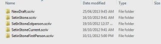 Another reason is that no matter how I try, I cannot ever write a true first draft. The draft I’ve sent to my editor is the first finished draft; it’s the first version in which I wrote right to the end of the story. But my project folder looks like this: